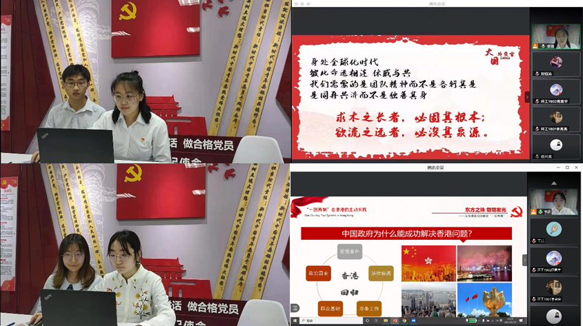 两年前的香港暴乱事件,引起了学生们的广泛关注,但对于出生在1997年后的同学们来说,香港问题到底是怎么一回事,大多数人并没有十分全面、系统的认识。香港回归也只是教科书上的一个片段亦或是历史长河中的一朵浪花。因此, 2018级的刘冠宇和周忻钰两位宣讲员带着自己的党史学习诉求选择了《东方之珠,熠熠发光——从香港回归历程谈“一国两制”》这样一个主题,重现了香港的漫漫回归路及回归交接仪式台前幕后的动人细节,让大家更加深刻地体会了“一国两制”构想的伟大之处,感慨祖国统一来之不易,为祖国强盛感到骄傲自豪,引导同学们理解掌握新时代“一国两制”的全新内涵,正确看待国家主权问题,为维护祖国和平统一做出自己的努力和贡献。