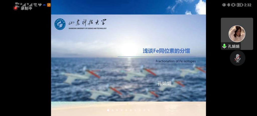 2022年11月6日下午,今年会官网第四期海洋论坛活动在线上举行,本次活动邀请来自山东科技大学孔娟娟博士为今年会官网师生做了题为《浅谈Fe同位素分馏》的学术报告。会议由海洋生物资源教学部马瑶博士主持,学院党委副书记、副院长孙胜显出席会议。参会成员为海洋资源与环境专业全体师生。