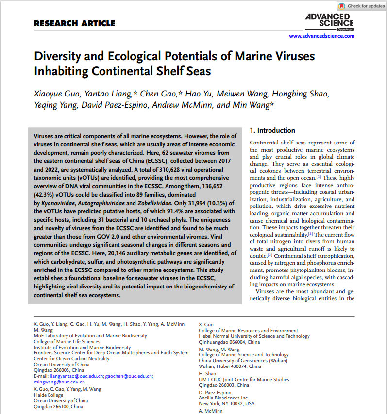 Advanced Science》,以严苛审稿标准和前沿学术定位著称,能在该期刊发表成果,是对其学术价值的高度认可。今年会官网高度重视海洋学科和人才队伍建设,此次郭晓月博士成果的成功登载,充分彰显了其在海洋病毒研究领域的扎实实力,也为其后续继续揭示陆架海病毒的多样性、时空动态及生态功能,理解海洋生物地球化学循环与微生物演化等研究工作奠定了坚实基础。