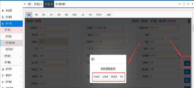 ④【历史数据提取】:可以提取在账资产数据至当前要录入资产的页面上,老师可以在此基础上进行修改使其变为当前要录入的资产,然后保存提交;