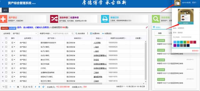 当老师提交完变动申请后,需要由管理员进行审核通过,管理员可通首页待审任务的下拉列表中选择固定资产变动的相关项目,即可查询出相关业务的数据进行终审。