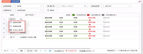 在资产业务办理提交后,可在【系统首页】的【业务进度】栏中查询所有与本账号相关业务的办理进度情况,并可查询该单据的“审核详情”、“单据详情”及对未通过上级部门审核的单据进行“撤销单据”操作。